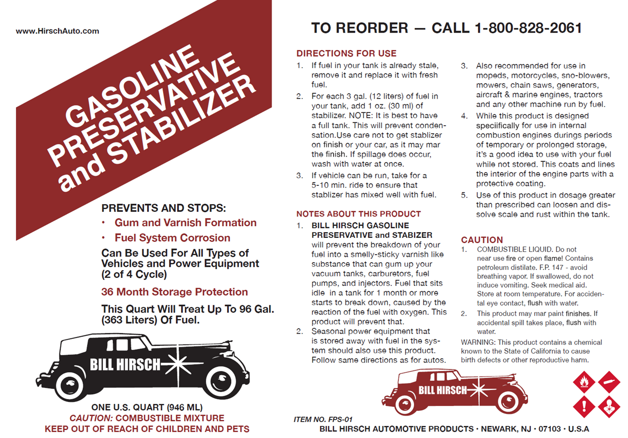 Prevents gum, varnish formation and corrosion in fuel tanks and fuel systems. Absolutely a must for cars, boats, planes or any other equipment whre the fuel sits idle in a tank for 30 days or more. One ounce of this product will keep 3 gallons of fuel fresh for at least 3 years. Contains no alcohol that attacks some metals. Will not attack rubber parts of diaphrams as most other do. Unlimited shelf life. Safe for all 2 or 4 cycle engines. One quart will protect 100 gallons of fuel for over 3 years. Retards decaying of ethanol fuels.