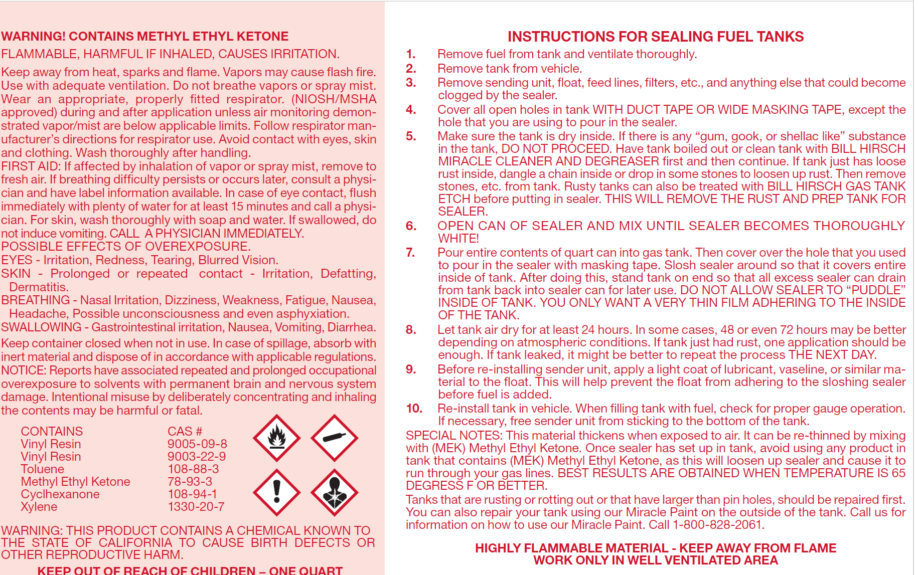 Click on drop down menu to choose size. World's No. 1 Gas Tank Sealer.This car fuel tank sealer is impervious to all fuel types. Over 2,000,000 sold to date. This is the best way to repair and restore your fuel tank. Simple application, includes extensive application information and product information sheet. This alcohol resistant gas tank sealer will seal pinhole leaks and prevent rusting. 1 Pint will seal a 10-12 gallon tank. Good for all fuel types. Works well with all metal and fibreglass tanks. Click here for