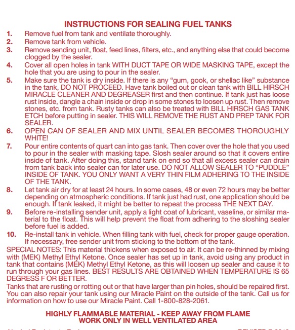 This item combines three of our classic car gas tank repair products into one complete kit that no restorer should be without. It is a three step process which includes 1) cleaner and degreaser, 2) etch, 3) alcohol resistant gas tank sealer. Dries rock hard and can be sanded. The kit is: 1 quart cleaner/degreaser. 1 pint Tank Etch 1 quart tank alcohol/ethanol resistant sealer. Detailed step by step instuctions ensure a succesful and permanent repair of your tank. Works well with all metal and fibreglass tanks. Click here for