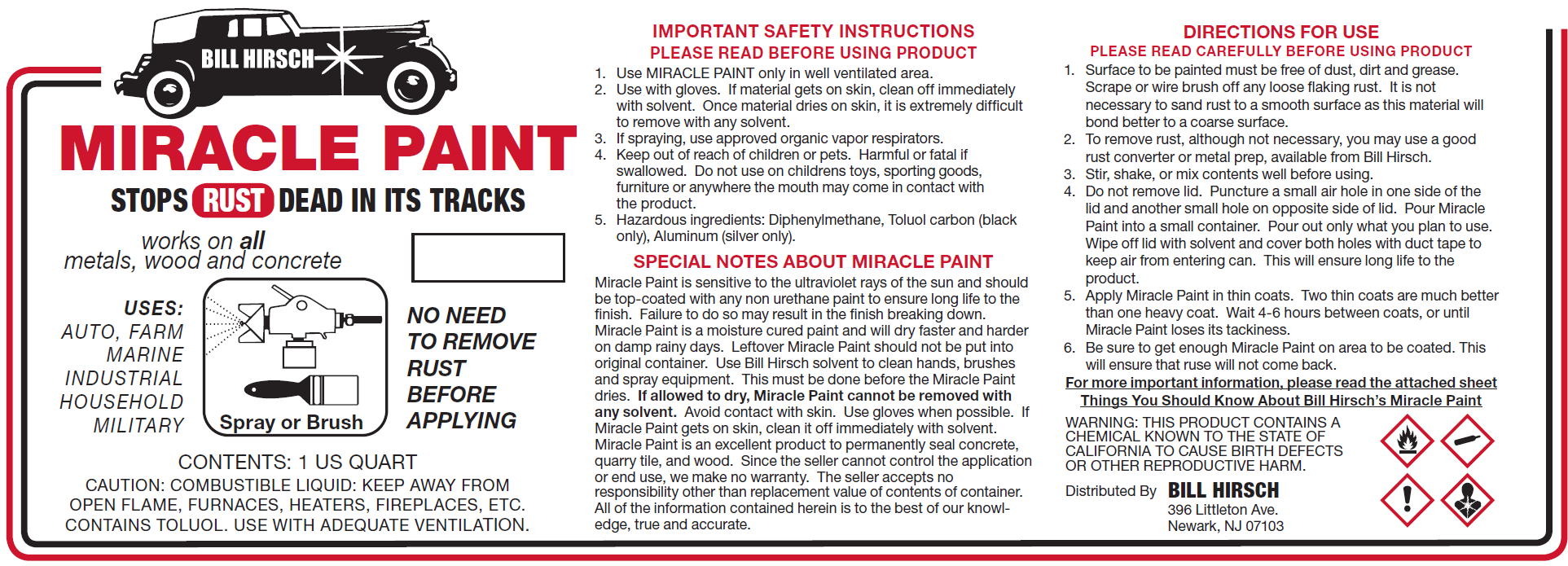 Bill Hirsch Miracle Paint is a moisture cured non porous paint that bonds to rusted and corroded metals like no other coating. It dries rock hard and will not chip, crack or peel. Impervious to gasoline, lacquer thinner, salt and most acids. This anti-rust car paint can be sprayed, rolled or brushed. Is strengthened by moisture. Will seal concrete, grout, wood, metal and porous tile like nothing else. Can be sprayed, rolled or brushed. One quart will cover roughly 45 sq feet of a standard flat surface. Comes with valuable product information sheet. Click for questions